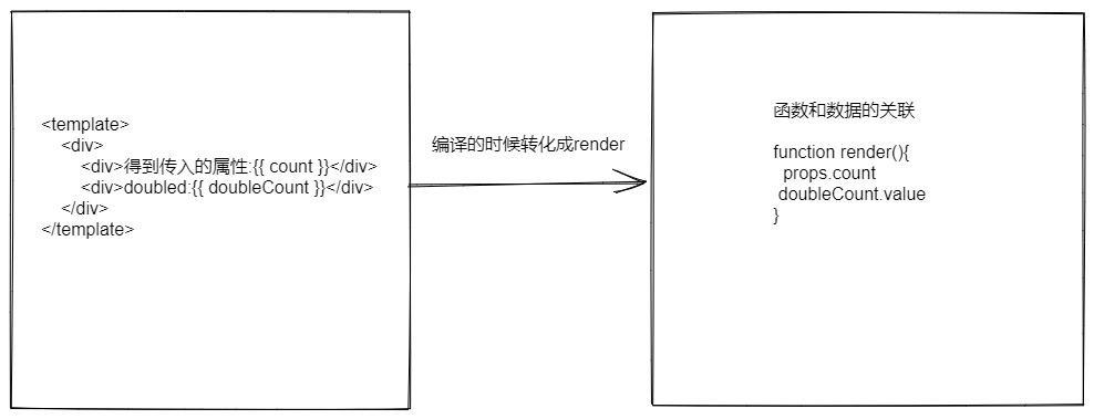 有人可能会发出疑问,template 中的代码是怎么发生响应式的呢。其实 template 的本质是render函数。我们来具体看一张图